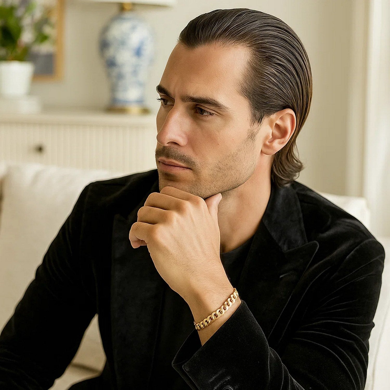 This curb bracelet comes in 10k yellow gold and has a width of 8.2 millimeters. Secured with a lobster clasp.