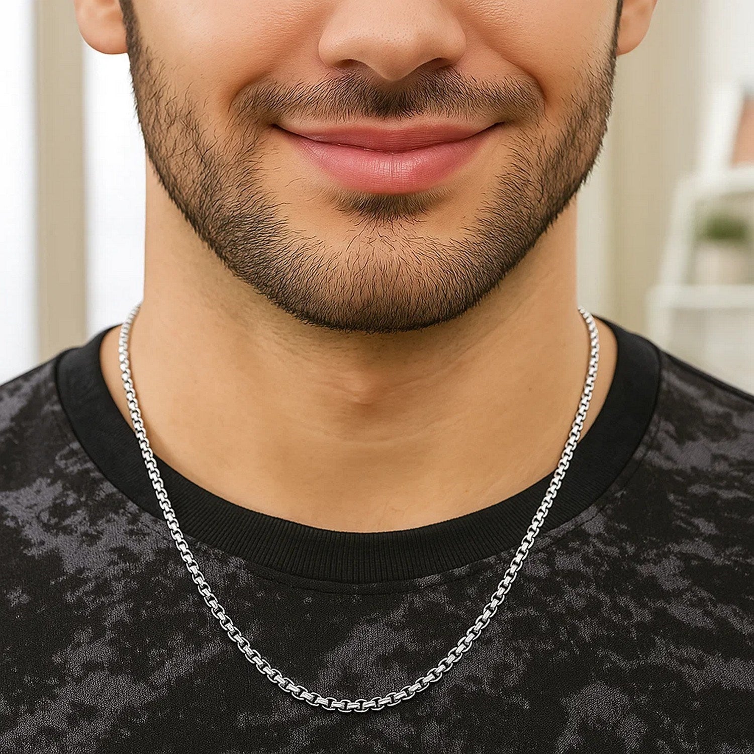 This rhodium-plated round box chain comes in sterling silver and has a width of 3.8 millimeters.
