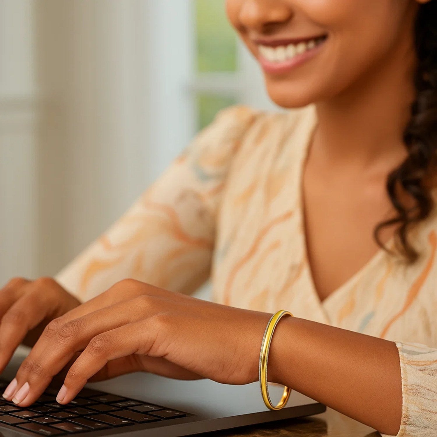 For those seeking a subtle touch, this exquisite two-tone bangle combines the timeless allure of 14k yellow gold with delicate silver edging, creating a striking contrast. The smooth polished surface radiates brilliantly, while the diamond-cut edging introduces an eye-catching sparkle. Thin and lightweight, this fancy bangle is designed for both comfort and style. Its understated sophistication allows it to be worn alone or layered with other pieces for a more dramatic effect.